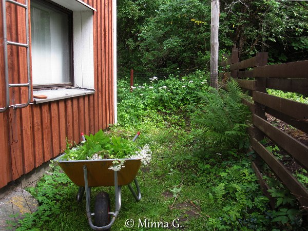 Kottikärryt alkoivat täyttyä vuohenputkesta… hyttyset ja paarmat söi! Ilmeisesti hyttysiä nousi kosteasta maasta kun nyhdin siitä rikkaruohoja irti… viime yönä satoi nimittäin vettä.