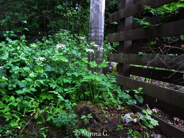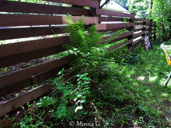 Talon sivussa, aidan vieressä kasvaa jokin saniainen ja Lumimarja. Molemmat saavat jäädä paikoilleen. Lumimarja on alunperin ollut naapurin puolella, mutta karannut sieltä omalle puolelle. Uudet naapurit vetivät pensaan ”alas”, mutta onneksi siitä jäi taimia 🙂