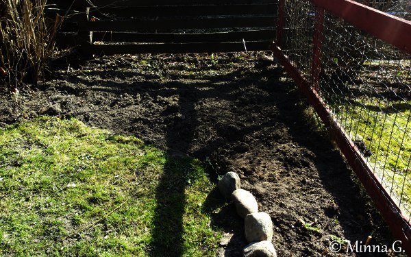 Tähän kohtaan lopetin sitten projektin tältä päivää. Maata on tasoiteltu, ja reunamia lapioitu. Vielä sen verran painelen pihalle takaisin, että käyn tasoittamassa tuota maata hetken kumisaappaat jalassa. Saan paineltua maan kunnolla… krokseilla oli hieman hankalaa kun meni mullat rei’istä sisään. Se ei ollut kovinkaan mukavaa. Jossain vaiheessa kun pääsen suihkuun asti, niin ttäytynee etsiä juuriharja, että saan varpaani puhtaiksi 😀